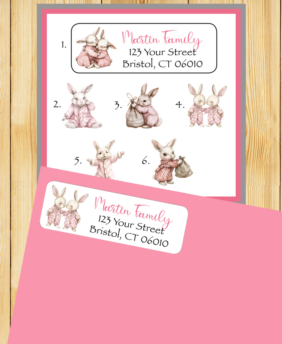 Sets of 30 per-page Personalized Bunnies in Pink PJs Labels