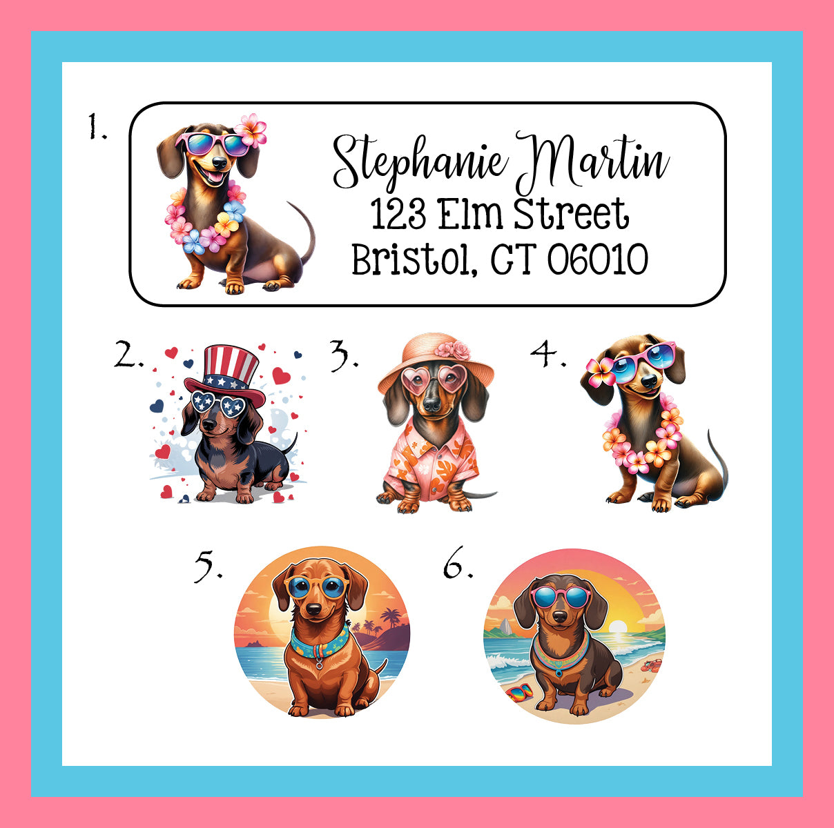 Sets of 30 per-page Personalized Summer Dachshund Labels
