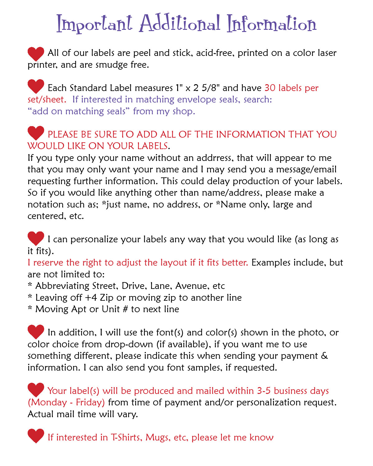 All our standard address labels are peel-and-stick, acid-free, smudge-free and printed on a color laser printer.
